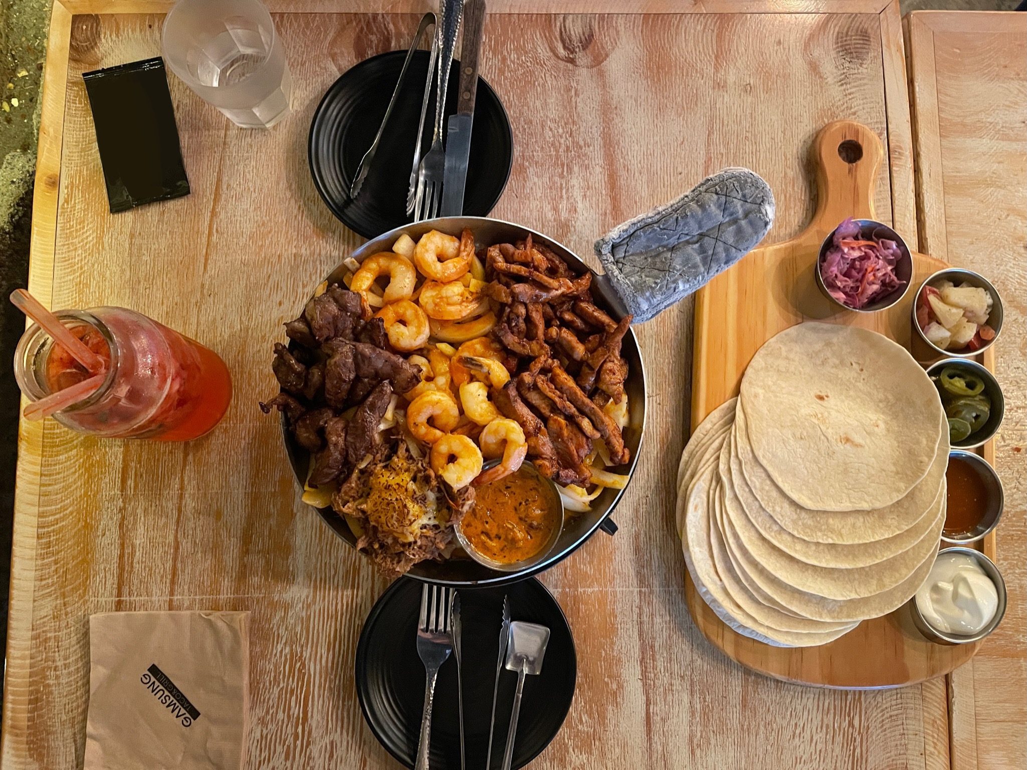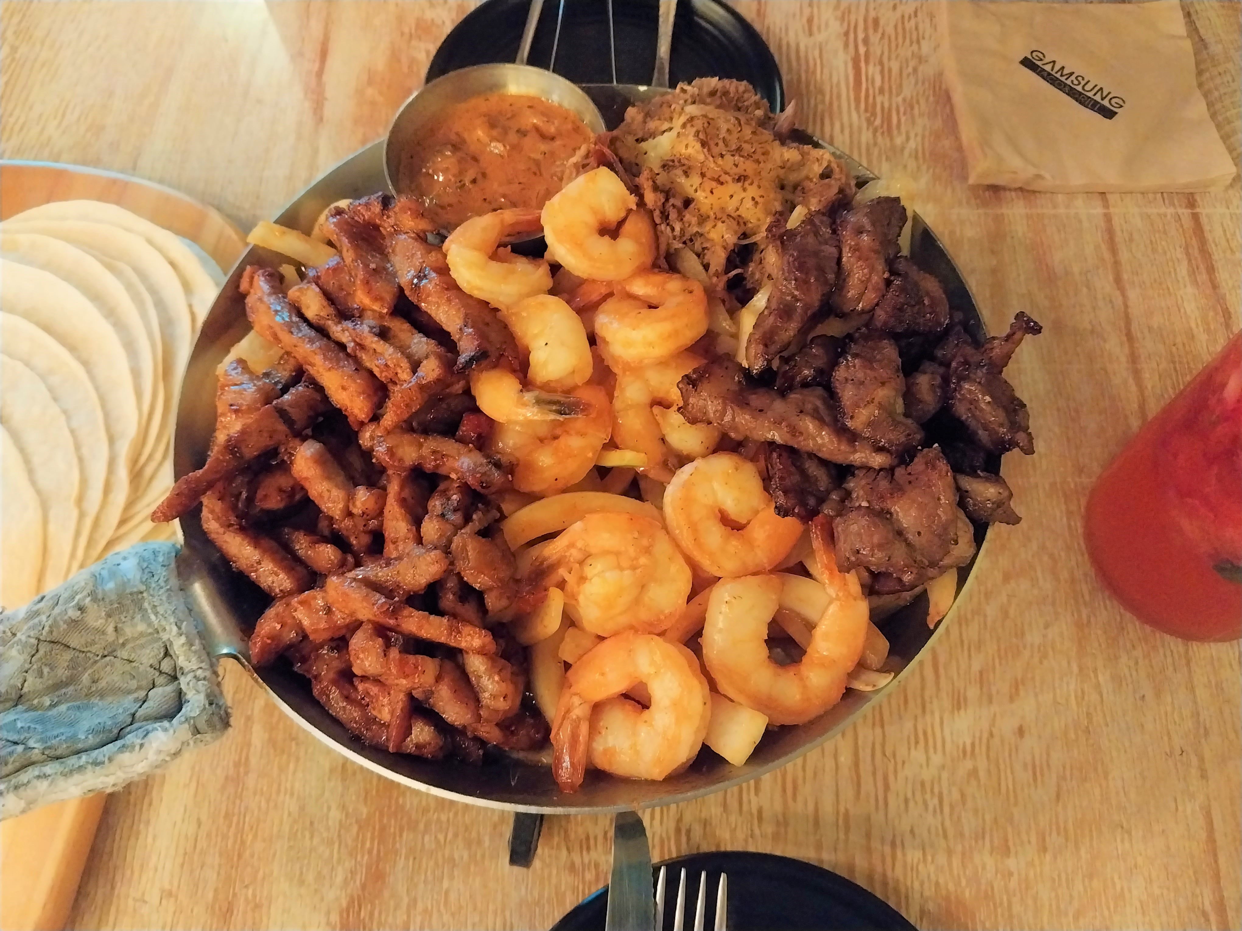 감성 그릴드 파히타는 '그릴드 스테이크, 칠리새우, 스파이시 포크, 까르니따스로 구성되어 있고, 토르티야(tortilla), 소스와 코울슬로, 할라피뇨, 파인애플 살사가 함께 나왔습니다.