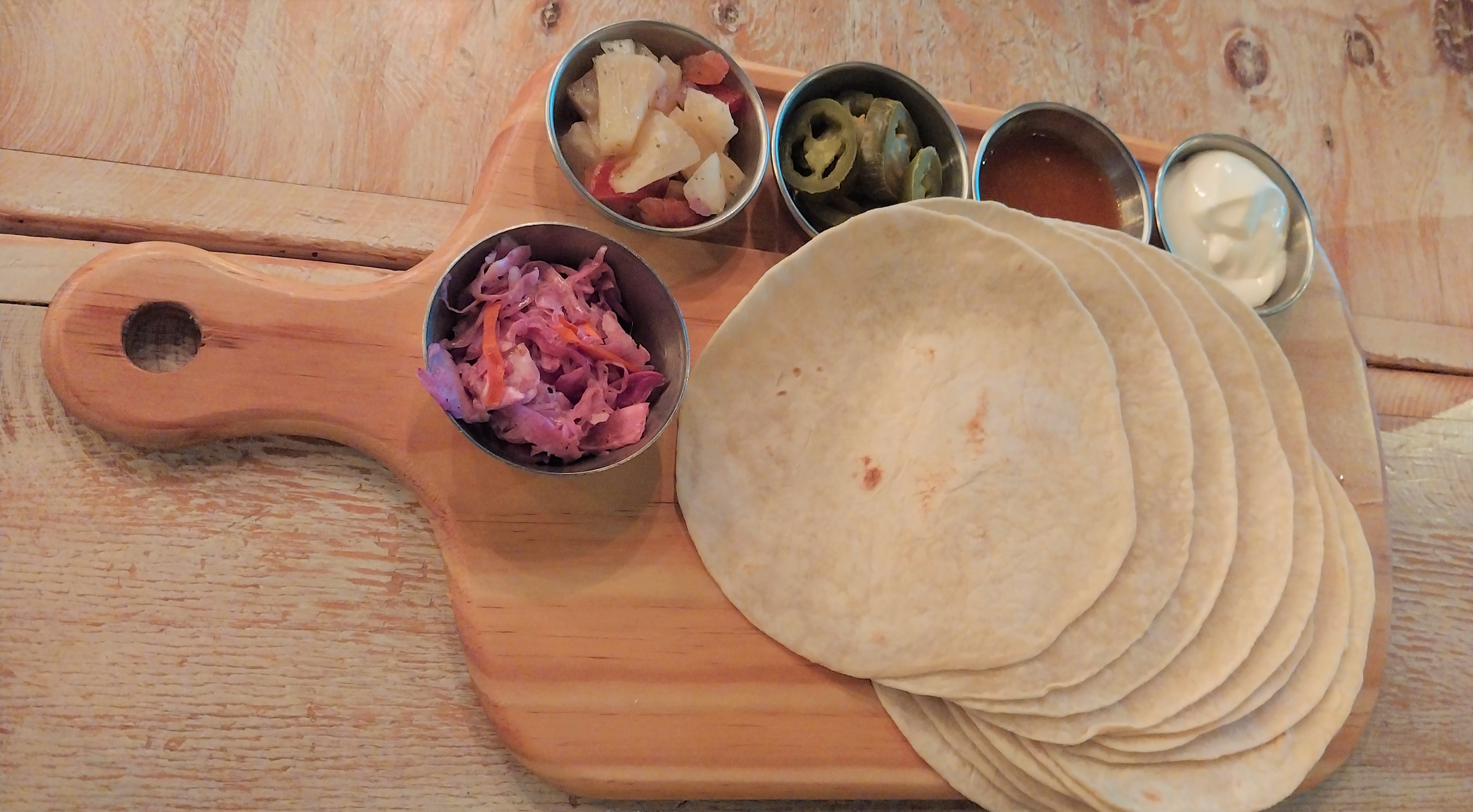 도마에 올려져 있는 토르티야와 소스, 코울슬로, 할라피뇨, 파인애플 살사는 리필할 수 있습니다.