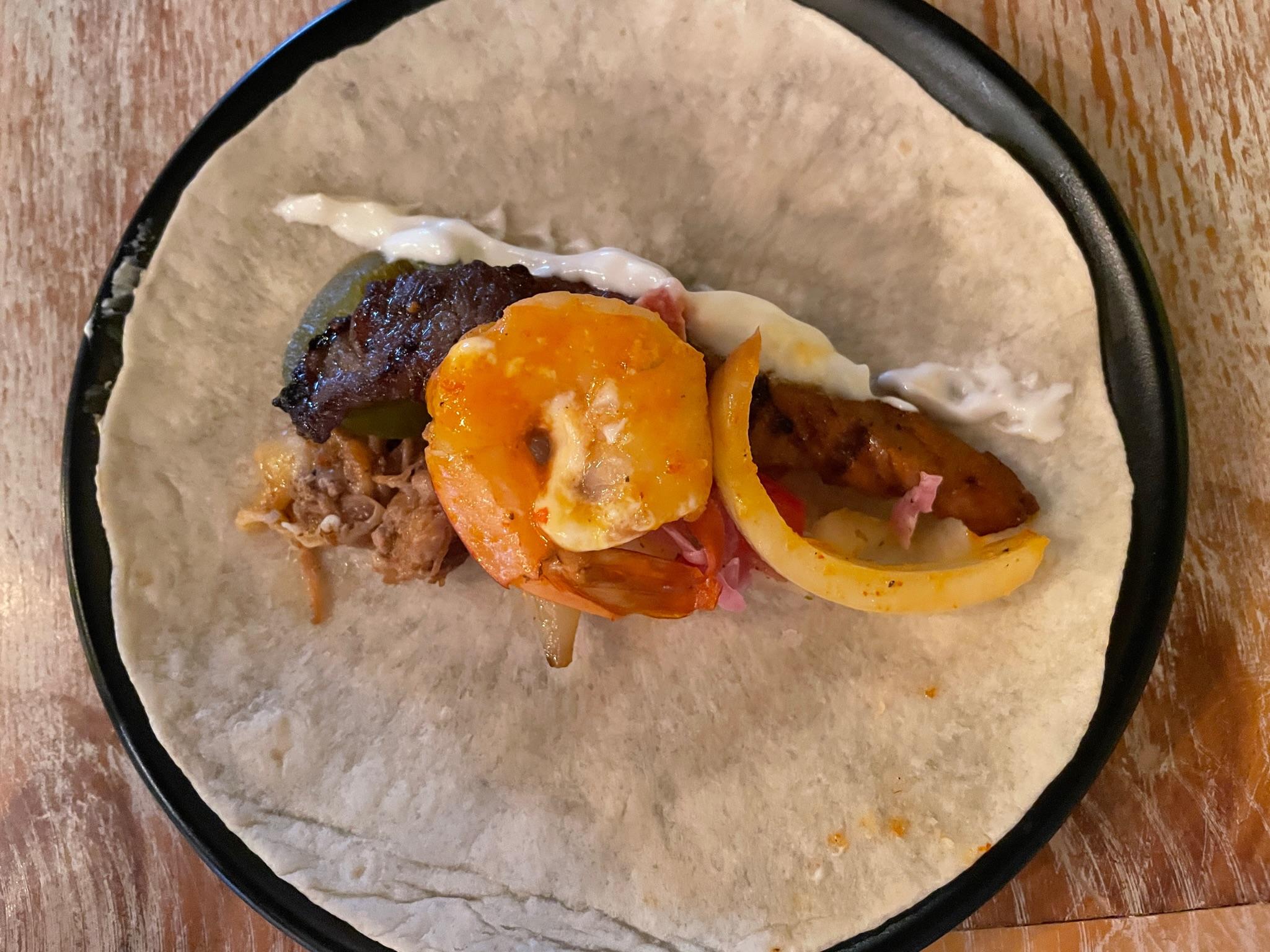토르티야에 칠리새우와 스파이시 포크 등 여러 가지 재료를 넣고 소스를 발라서 먹었는데 정말 맛있었습니다.