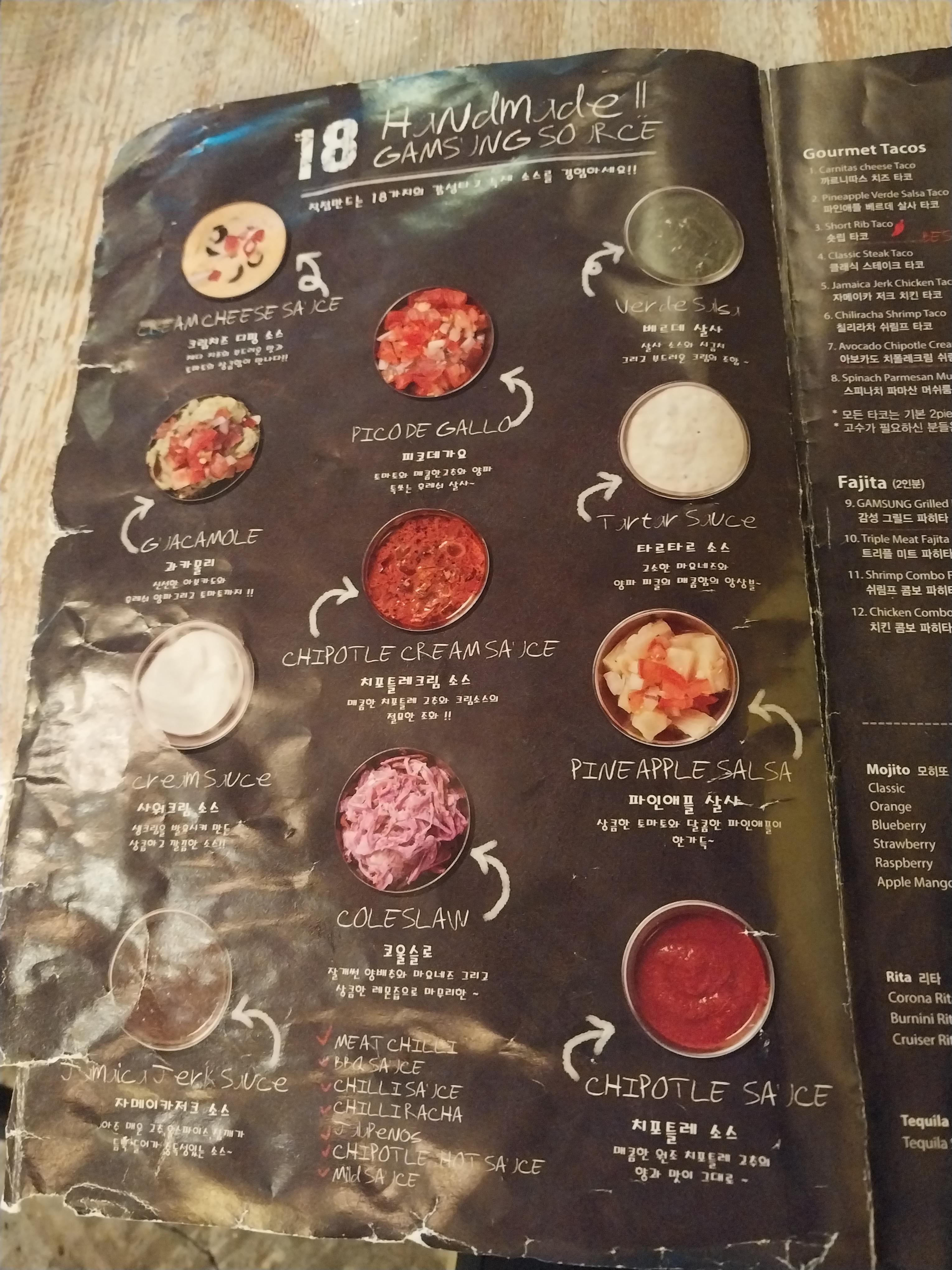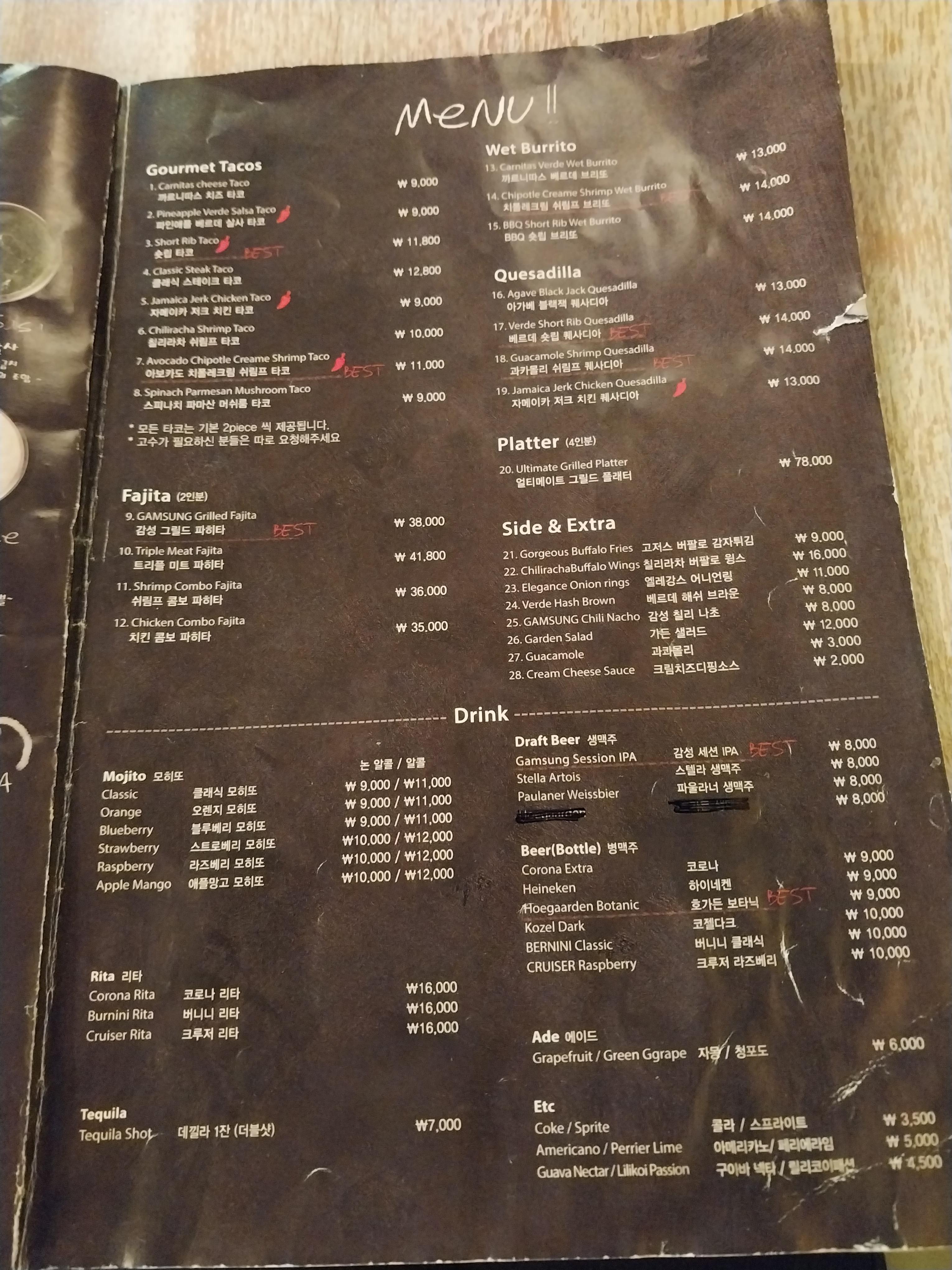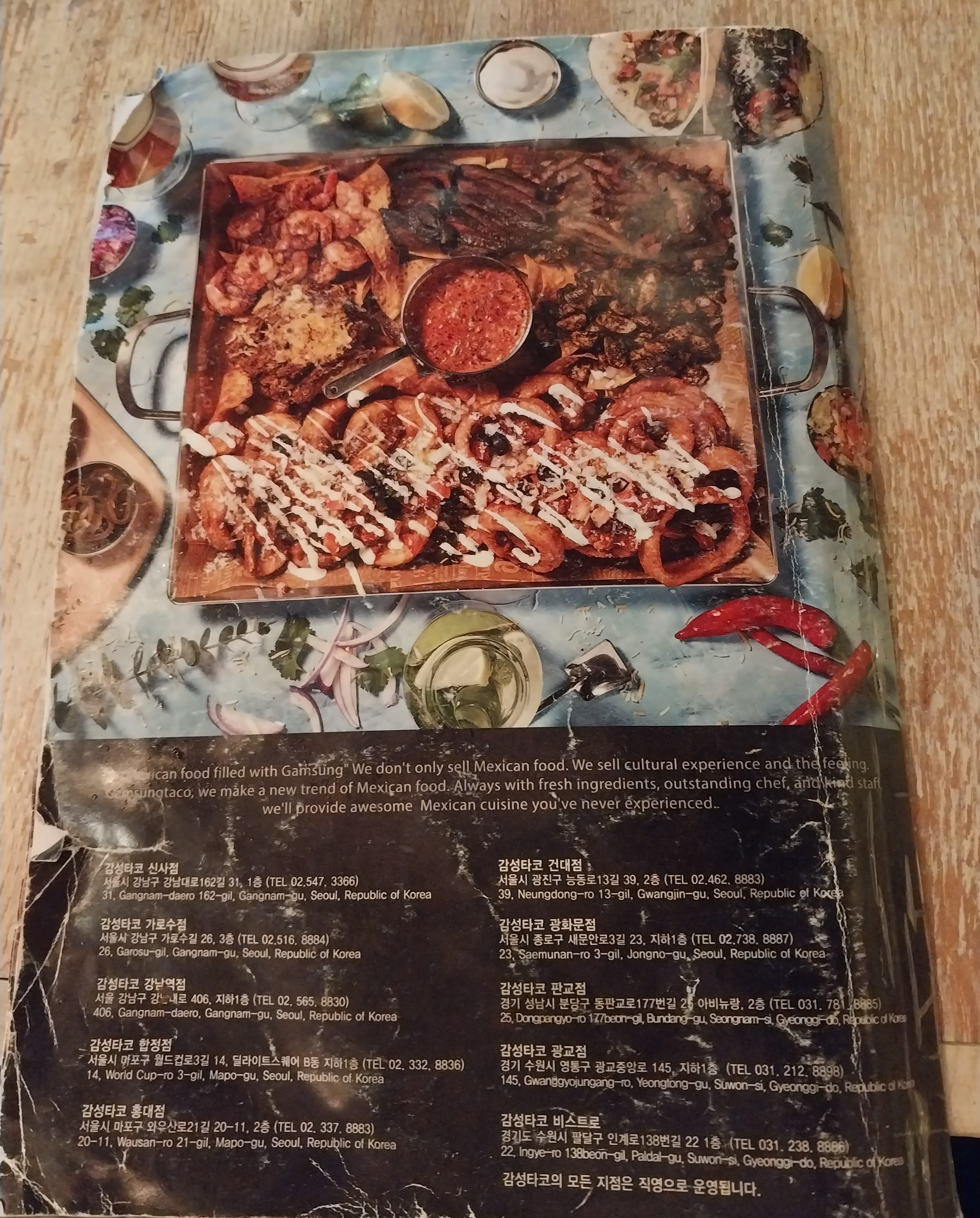 다른 메뉴도 궁금하실 분들을 위해서 감성타코 메뉴판 사진을 올려드립니다.