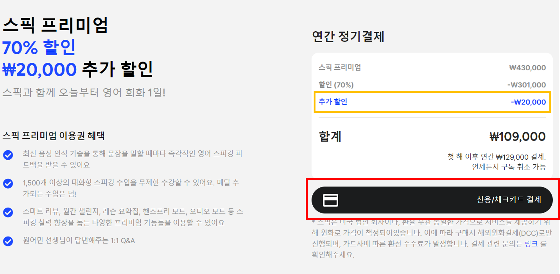 "스픽은 미국 법인 회사이나, 환율 무관 동일한 가격으로 서비스를 제공하기 위해 원화로 가격이 책정되어있습니다. 이에 따라 구매 시 해외원화결제로만 진행되며, 카드사에 따른 환전 수수료가 발생합니다."