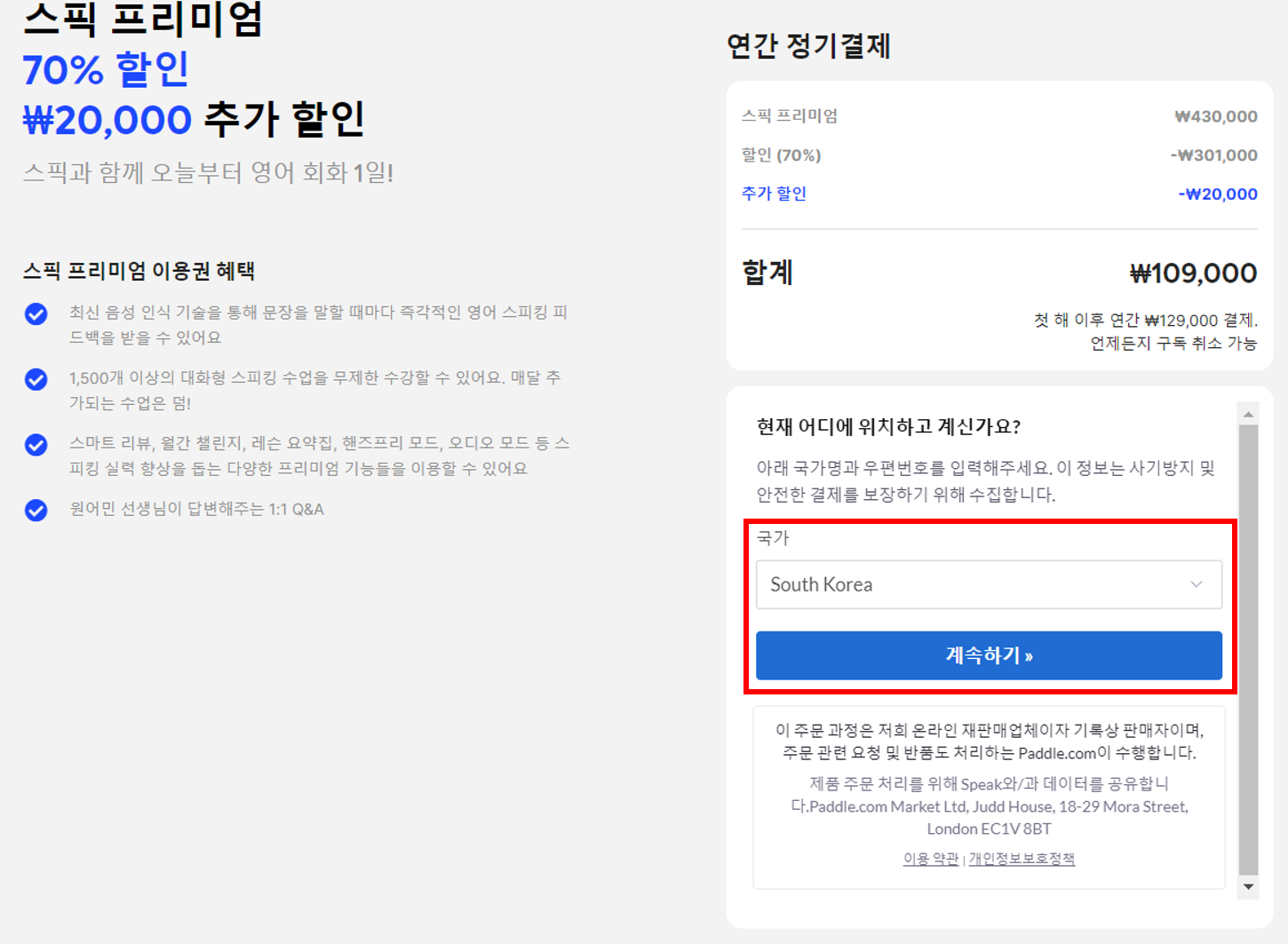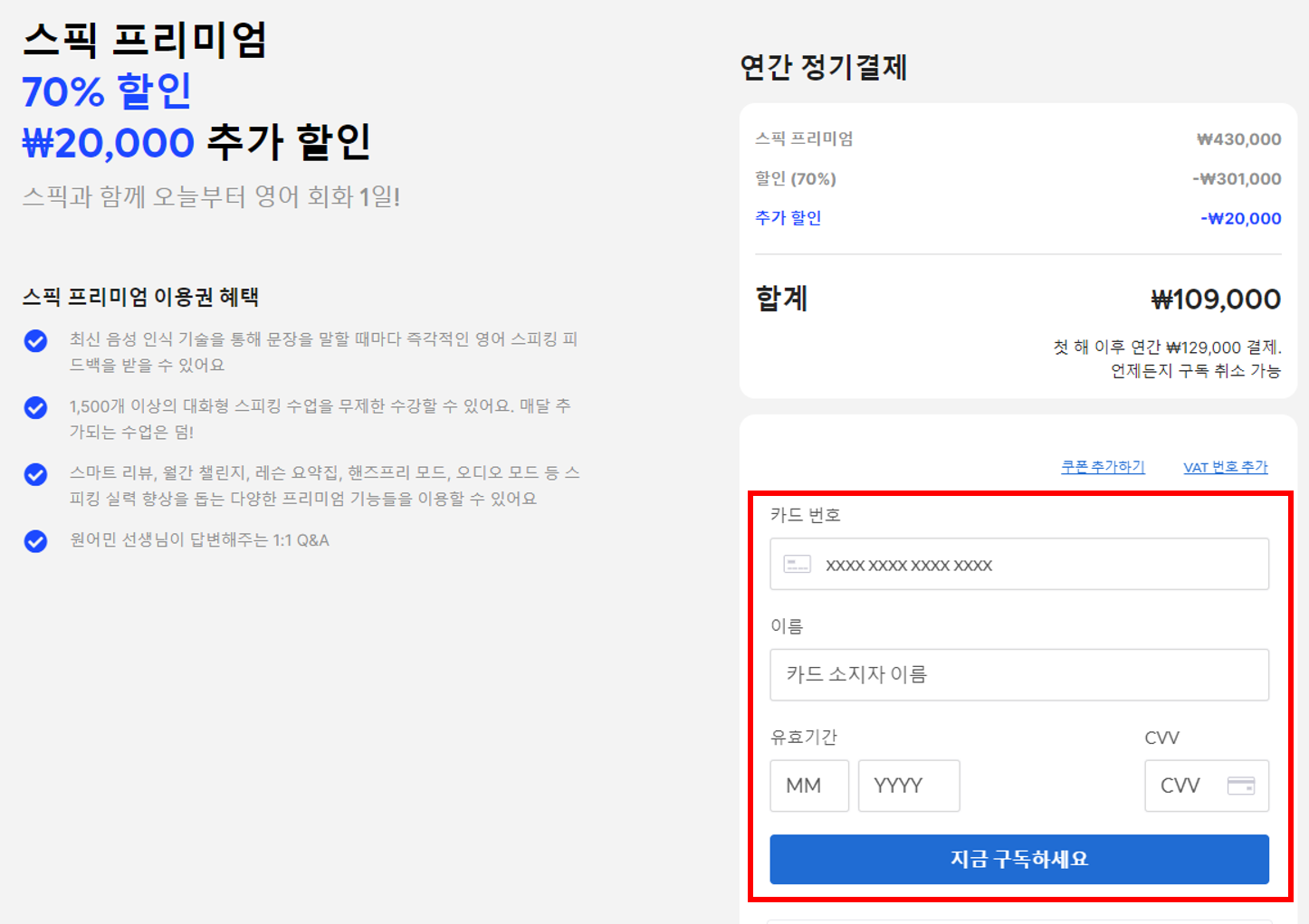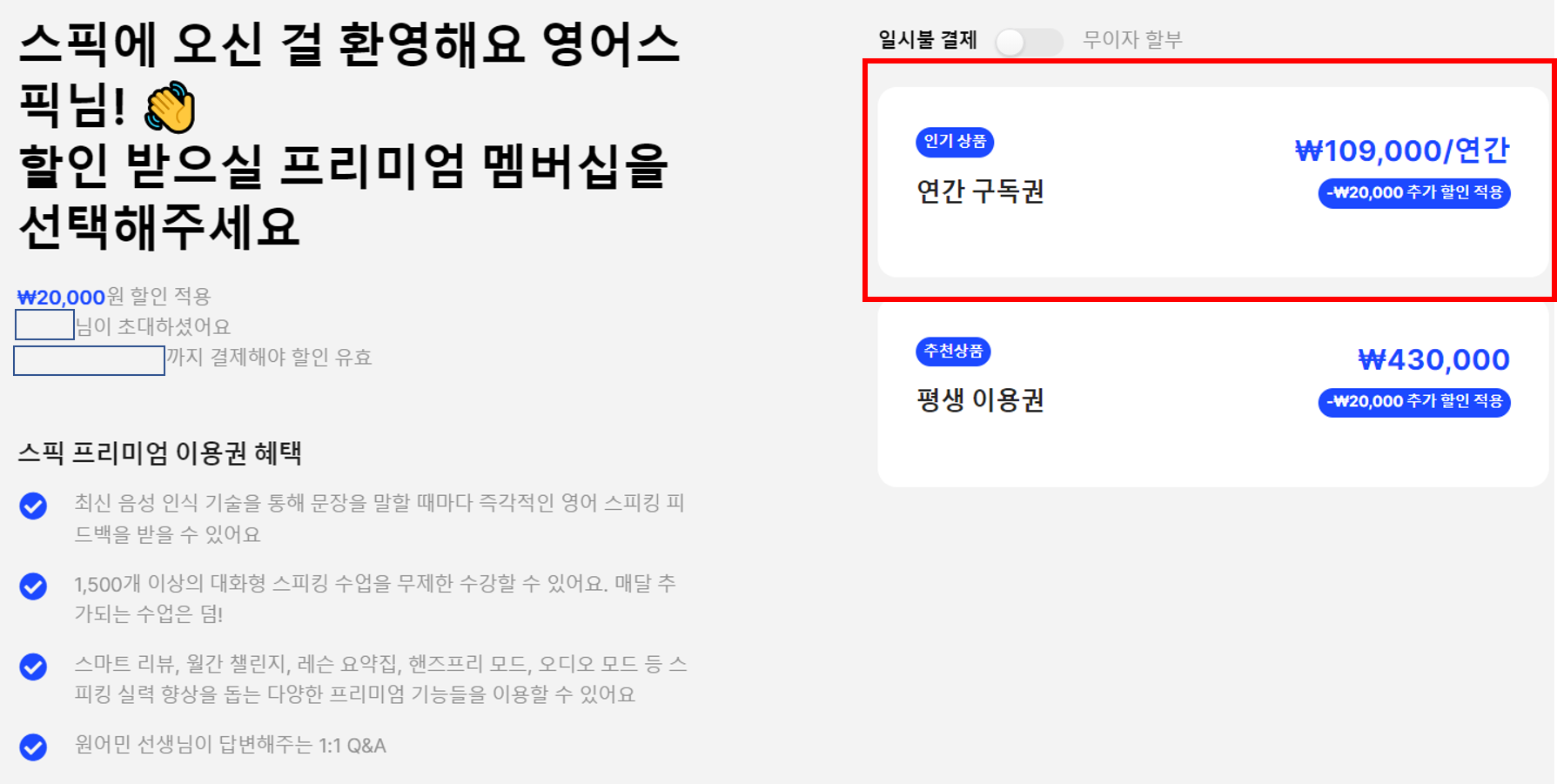 그럼 지금부터 2만원 할인을 적용하여 스픽 1년 구독권을 결제하는 방법을 말씀드리겠습니다.