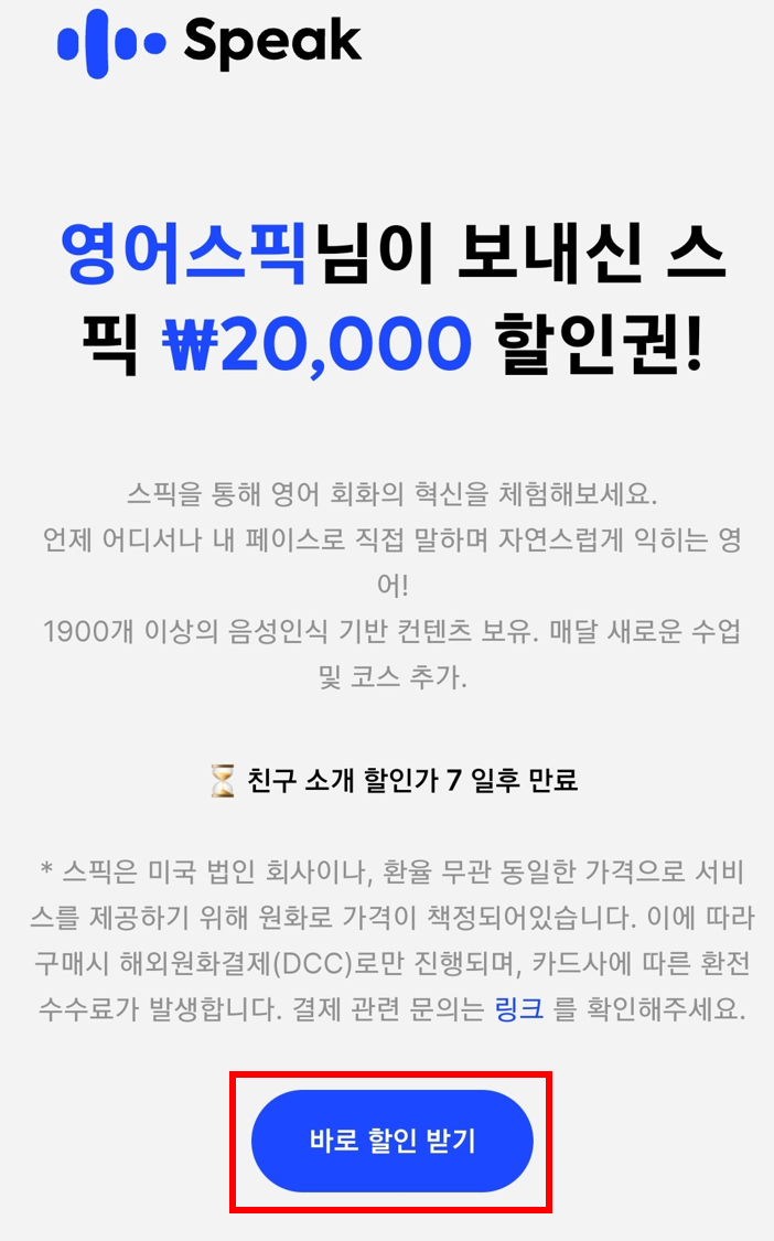 지금까지 영어 회화를 공부할 수 있는 스픽(Speak) 앱을 할인권(초대권)을 통해 2만원 할인받아서 연간 구독권을 구매하는 방법을 알아보았습니다.